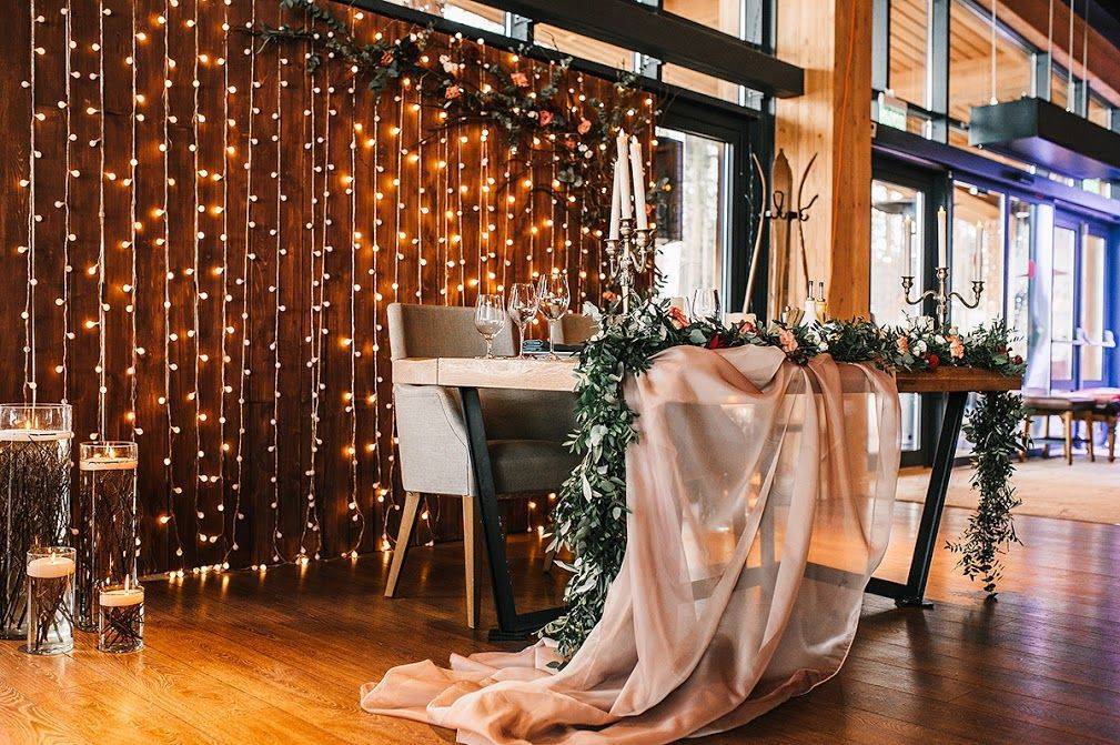 Цельное оформление свадебного стола гирляндами дождиками – это еще один очень интересный вариант. Вы можете включить в свой декор и другие элементы, например, занавес светящийся дождь, плей лайт светодиодный или гирлянда штора падающий дождь. Это создаст дополнительный эффект света и делает ваш декор более запоминающимся.