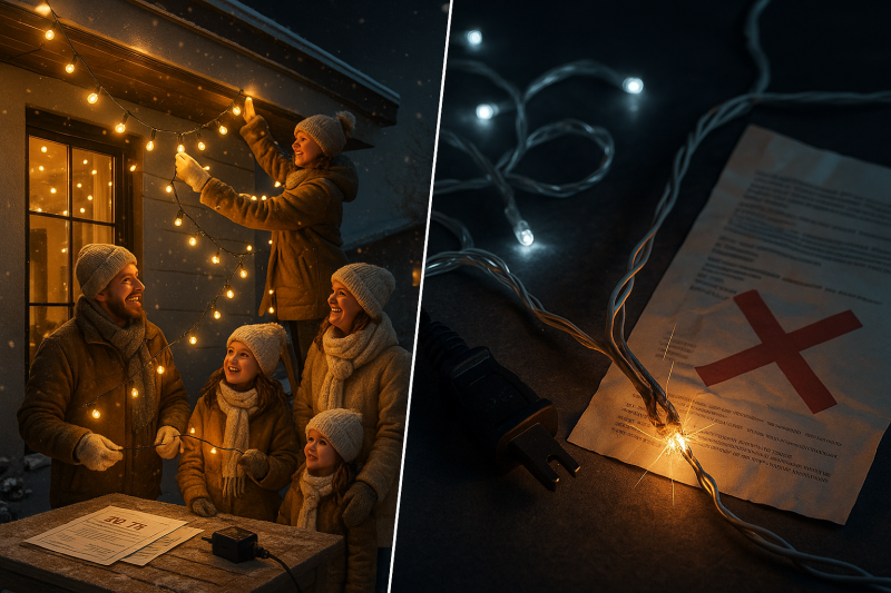 - Смешение назначения: Никогда не используйте гирлянды для дома на улице. И наоборот, не стоит брать мощные уличные гирлянды для декора интерьера — они часто рассчитаны на более высокое напряжение и могут быть излишне яркими для помещений.