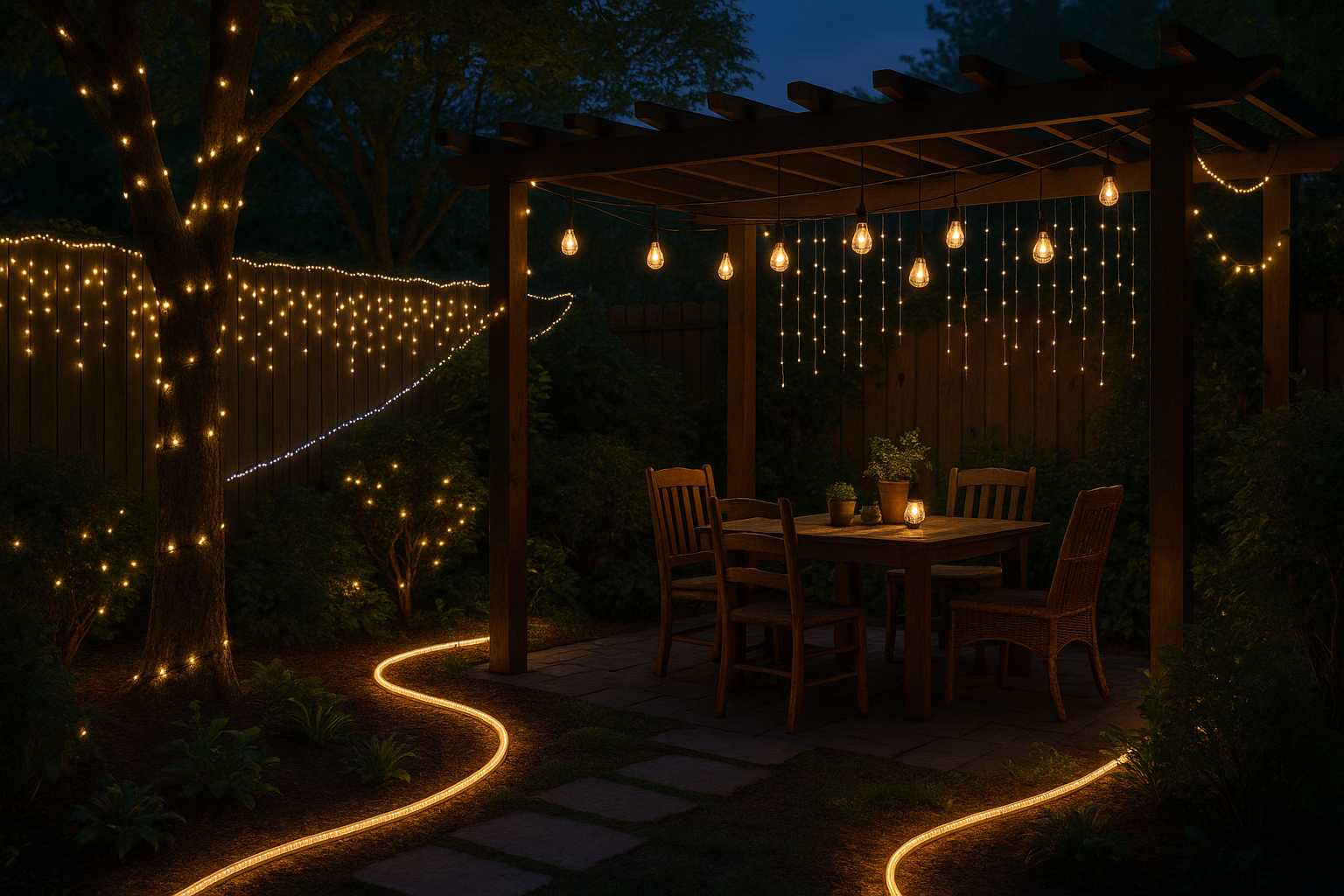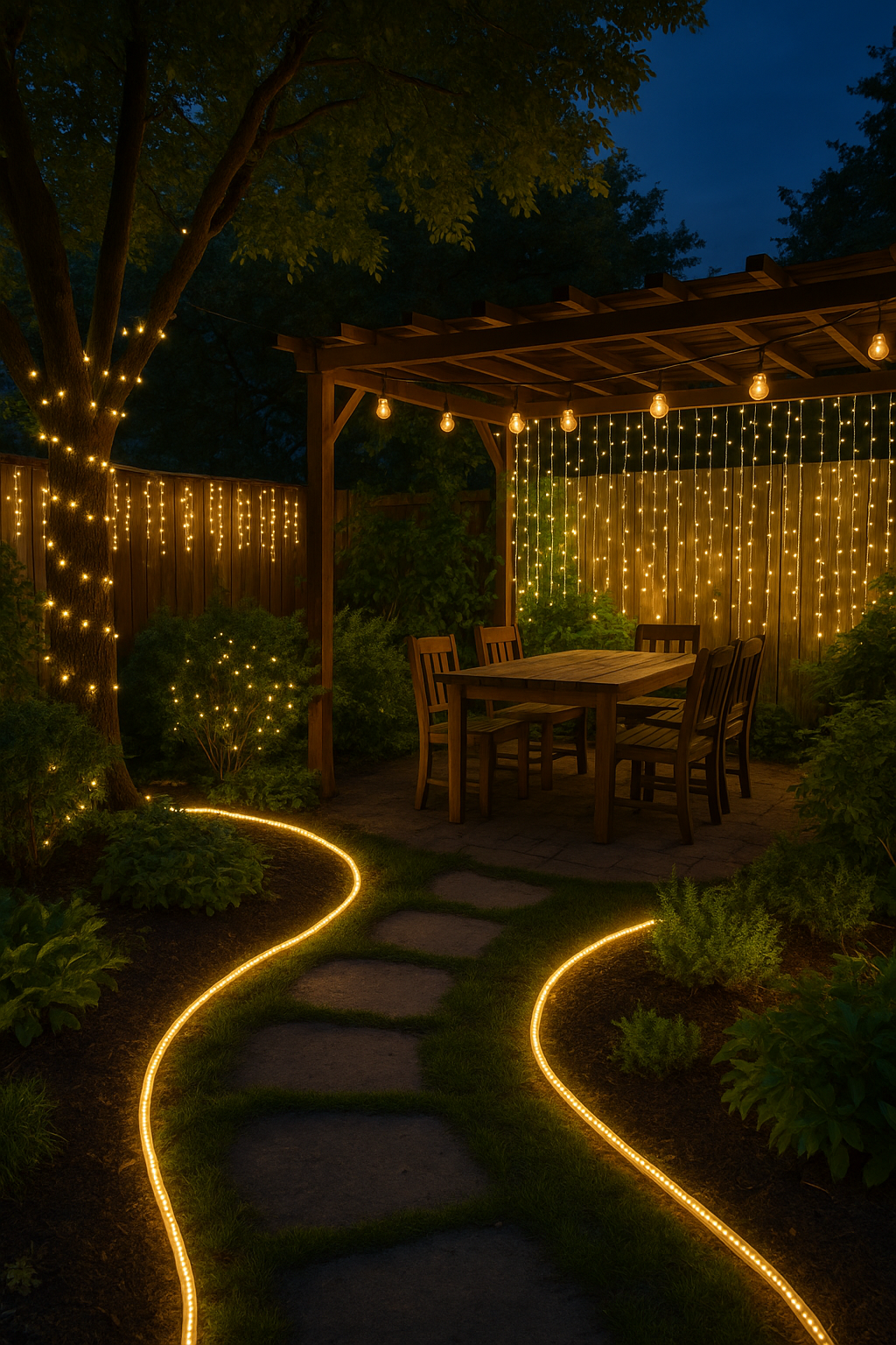 Самый выразительный декор — комбинация разных типов. Например, по периметру столовой зоны — ниточные гирлянды, по забору — дюралайт, вдоль крыши — дождь, а возле входа — ламповые гирлянды. Так возникает эффект «звёздного дождя»: интерьер реагирует на каждый участок пространства. Главное — не перегрузить: зато каждая зона будет «со светом».