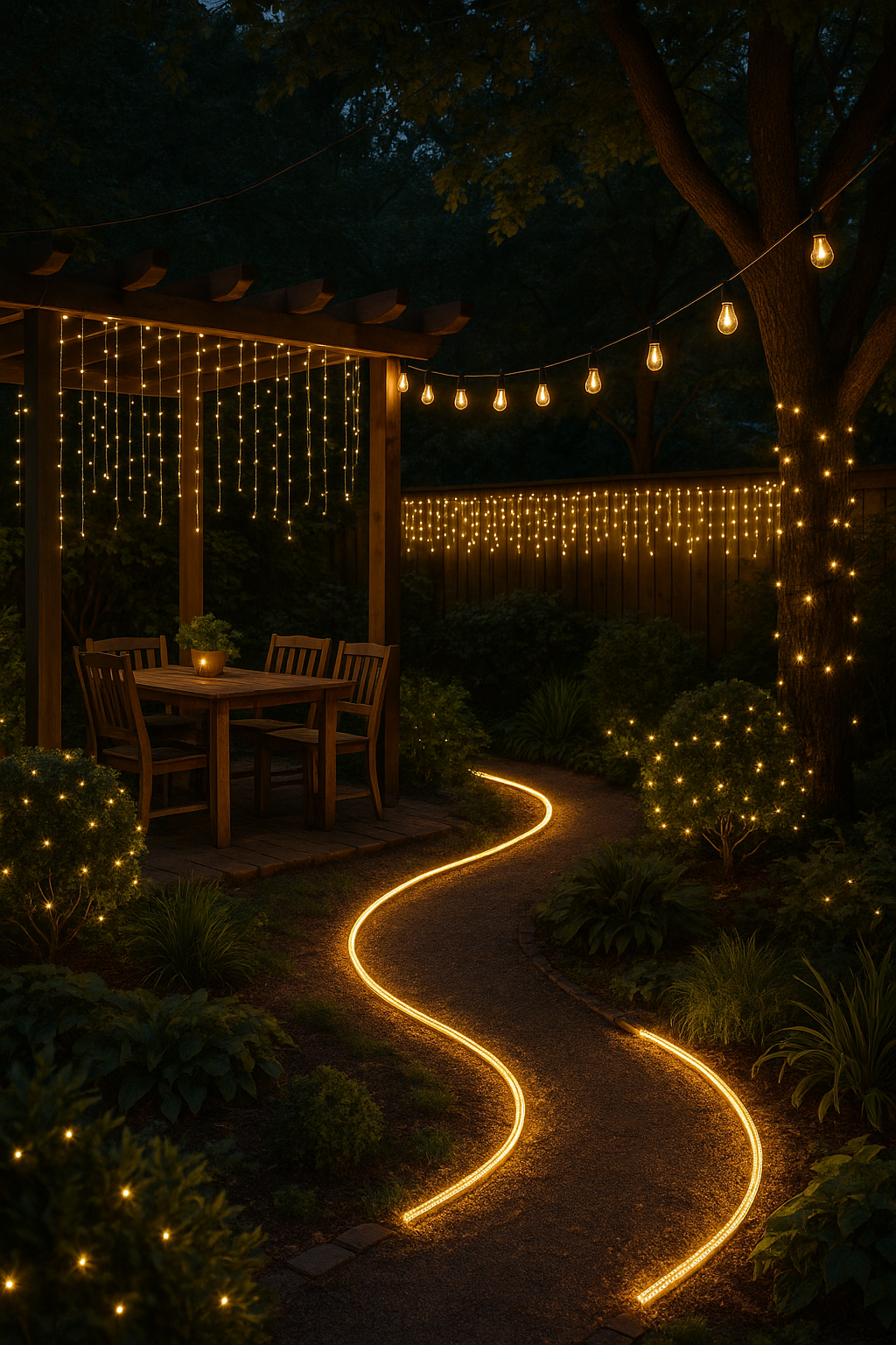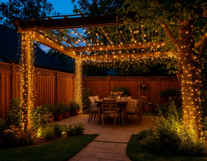 Каскадные гирлянды-дождь позволяют «притянуть» свет к тёмной поверхности — карнизу, беседке или навесу. Их свисающие нити выглядят как стеклянная дюжина живых фонариков, особенно если их чередовать по длине и цветовой температуре. Вечером за счёт многослойности складывается глубина изображения: подсветка фасадов, свечения дождевых нитей и приглушённый свет дорожек. Эффект усиливается, если использовать модели с функцией мерцания или таймером, создающим ощущение медленной смены капель.