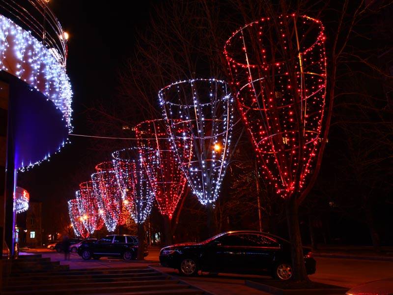 Дюралайт пользуется популярностью у декораторов, особенно в период Рождества. Светодиодный шнур не только способен создать уникальные визуальные эффекты, но и отлично противостоит атмосферным осадкам и перепадам температур. Можно дюралайт купить в специализированных магазинах. Светодиодным шнуром легко украсить стены или столбы, он подходит для создания креативных объемных композиций. Для украшения столбов используйте консоли, это отличный способ праздничного изменения пространства. Если необходимо купитьновогодние консоли на столбы, посмотрите предложения специализированных интернет-магазинов. Новогодняя светодиодная подсветка деревьев нынче стала доброй традицией. Но у декораторов еще много идей, которые обычные изделия превращают в шедевры. Не ищите в каталогах светодиодных изделий «уличные гирлянды на дерево в форме шара цена», декораторы используют обычную гирлянду «Клип Лайт» или «Клип ЛайтСпайдер» На крону дерева устанавливают легкий каркас, который имеет форму шара.