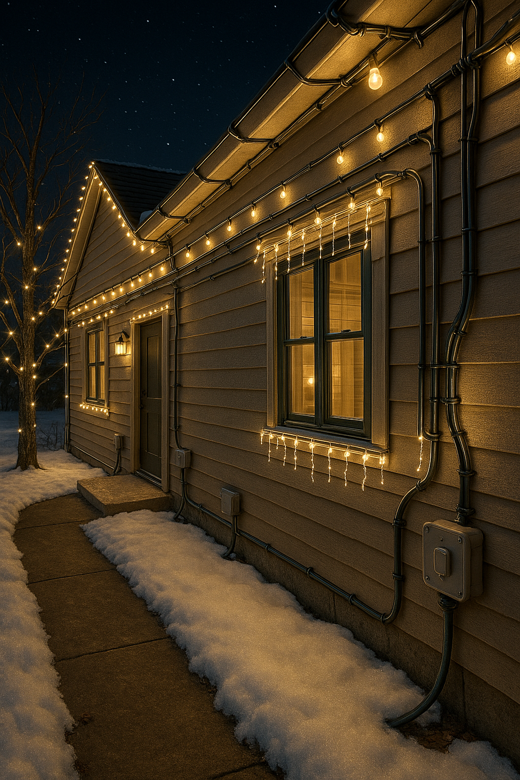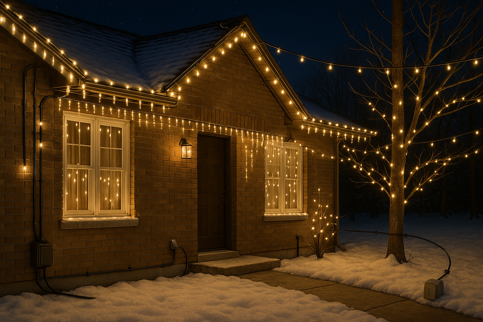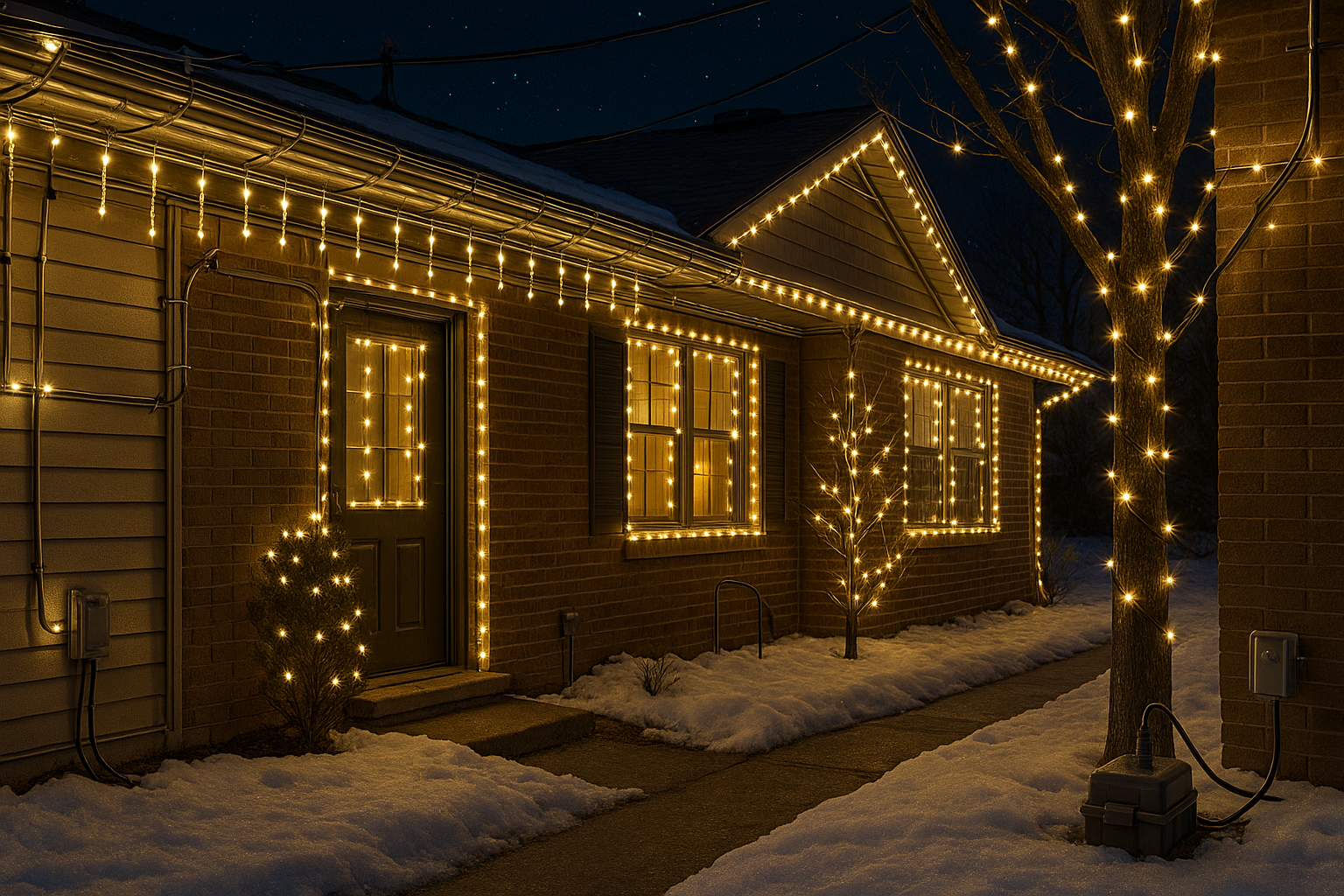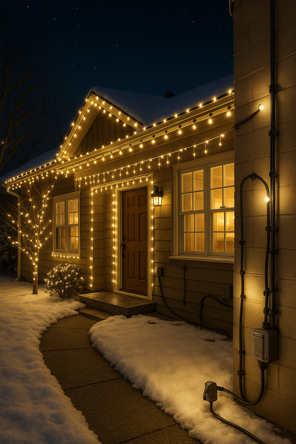 Уличные гирлянды рассчитаны на влагу и низкие температуры, но даже они требуют осторожности. Во время дождя или снегопада убедитесь, что соединения надёжно закрыты, а питание отключено до полного высыхания. Не включайте гирлянду в сыром состоянии, чтобы не спровоцировать короткое замыкание. Подключение следует делать к заземлённой розетке через качественный удлинитель, рассчитанный на суммарную мощность потребления всех гирлянд. Ни в коем случае не используйте слишком длинные или дешёвые удлинители – они часто греются и выходят из строя при высокой нагрузке. Для защиты от скачков напряжения полезен сетевой стабилизатор или устройство защитного отключения (УЗО), чтобы резкий перепад не «перегрел» светодиоды и блок питания.