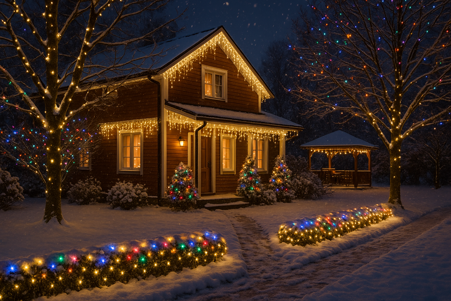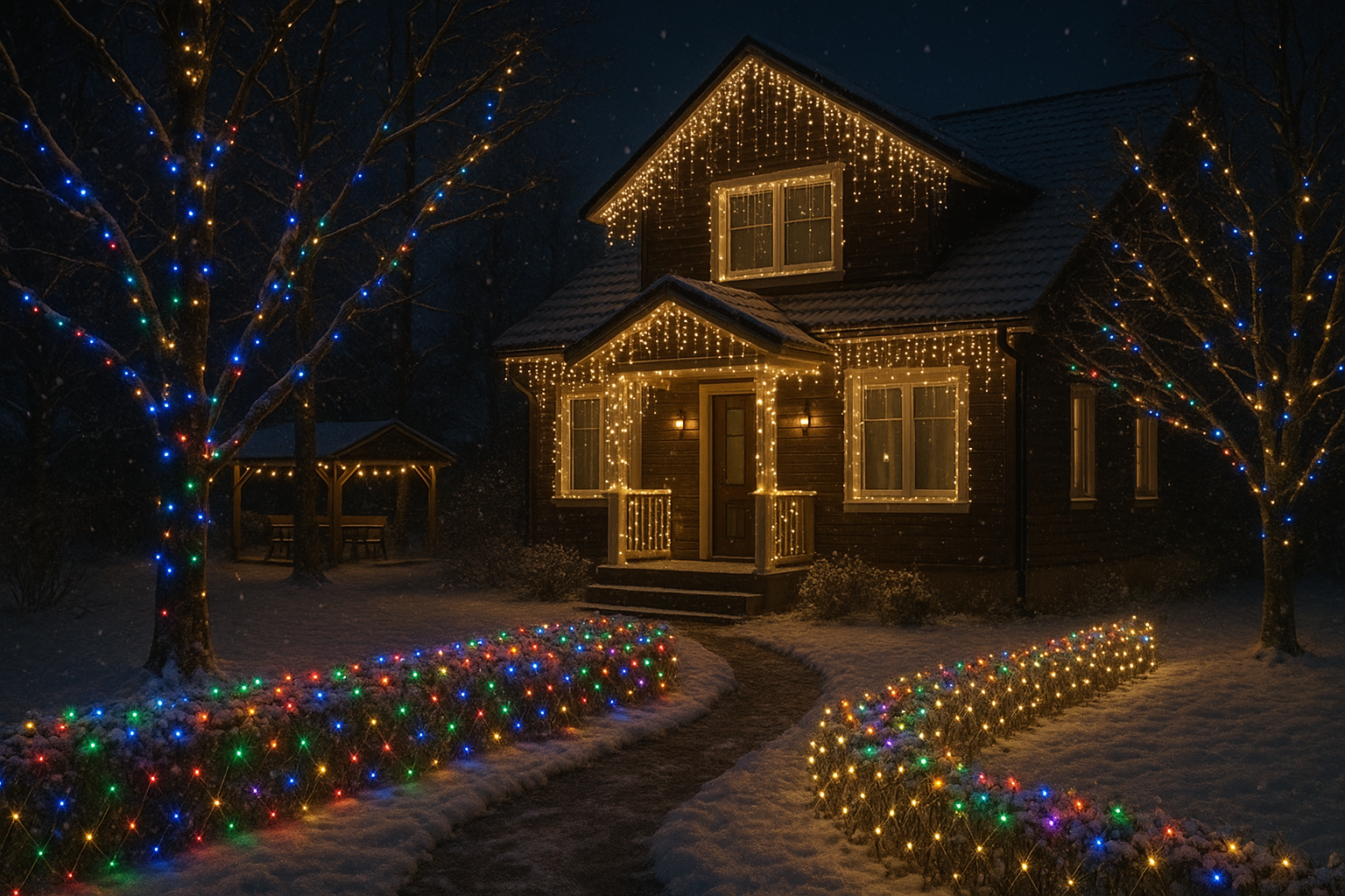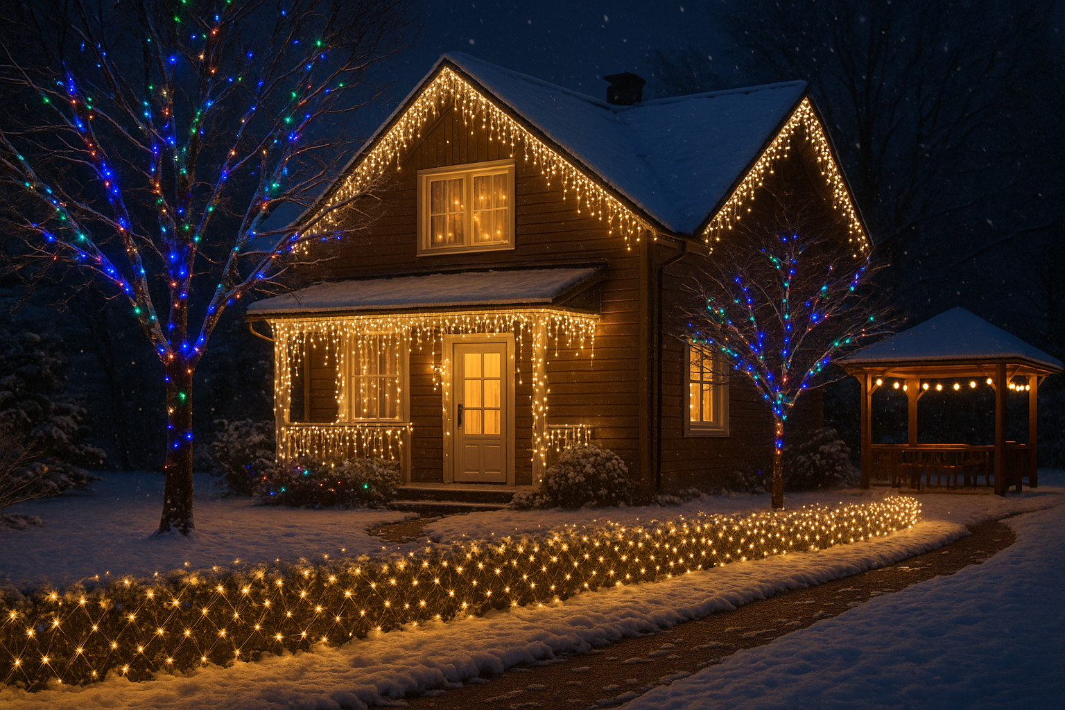 Это одна из самых выразительных уличных форм, имитирующая стекающие по крыше «сосульки» из света. Существует два подтипа: классические капли и каскадные трубки (снежный эффект). Как отмечает Christmas Lights Etc, LED‑каскады легко соединяются друг с другом, создают эффект «снега» и выглядят особенно натурально.