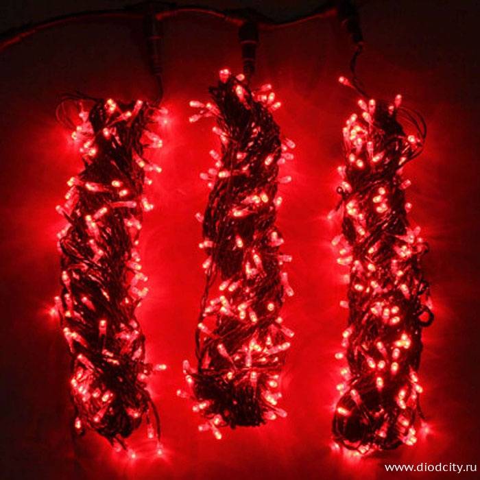 На 3-х ПВХ проводах, расходящихся от понижающего трансформатора 24В, расположены яркие, красные диодные светильники, имеющие огромный рабочий ресурс. Рассчитанная на внешний монтаж гирлянда надёжно защищена, индекс влагозащиты изделия IP54. Каталог DiodCity – обширный выбор эксклюзивных гирлянд на деревья.Вы можете выбрать один из двух вариантов оплаты: