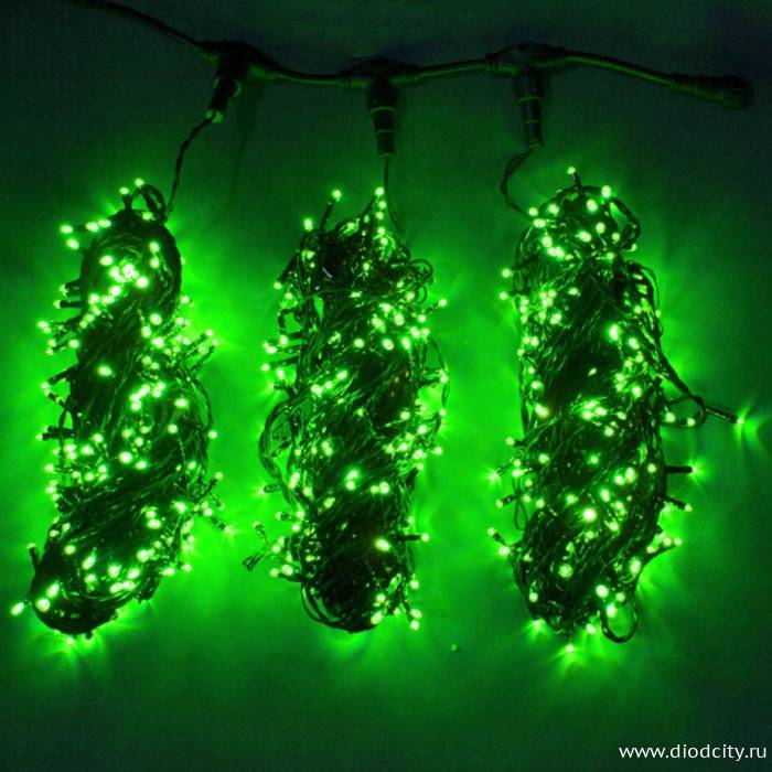 На 3-х ПВХ проводах, расходящихся от понижающего трансформатора 24В, расположены яркие, зеленые диодные светильники, имеющие огромный рабочий ресурс. Рассчитанная на внешний монтаж гирлянда надёжно защищена, индекс влагозащиты изделия IP54. Каталог DiodCity – обширный выбор эксклюзивных гирлянд на деревья.Вы можете выбрать один из двух вариантов оплаты: