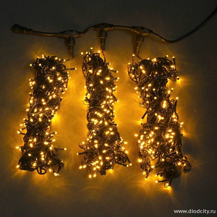 На 3-х ПВХ проводах, расходящихся от понижающего трансформатора 24В, расположены яркие, желтые диодные светильники, имеющие огромный рабочий ресурс. Рассчитанная на внешний монтаж гирлянда надёжно защищена, индекс влагозащиты изделия IP54. Каталог DiodCity – обширный выбор эксклюзивных гирлянд на деревья.Вы можете выбрать один из двух вариантов оплаты: