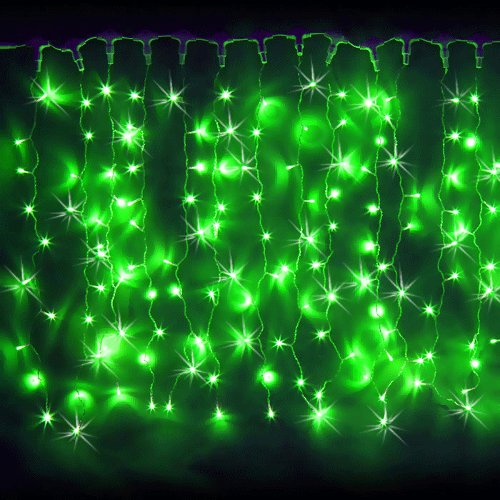 Яркая мерцающая гирлянда светодиодный дождь с зеленым свечением, 2*1,5 метра обладает высоким уровнем защиты от влаги IP 44, может применяться как в интерьере, так и снаружи. Ресурс источников света составляет 60 000 часов, а низкий уровень энергопотребления - результат использования LED технологий.