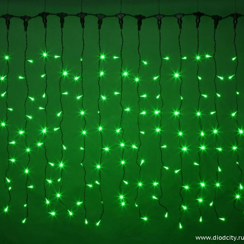 Зеленые светодиоды расположены на нитях из прозрачного/ чёрного провода длиной 1,5 метра. Ширина светового устройства (шина) составляет 2 метра. Потребляя всего 34 Вт, гирлянда является выгодным предложением, поскольку ресурс диодов составляет до 100 000 часов.
