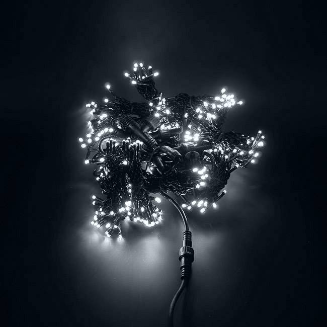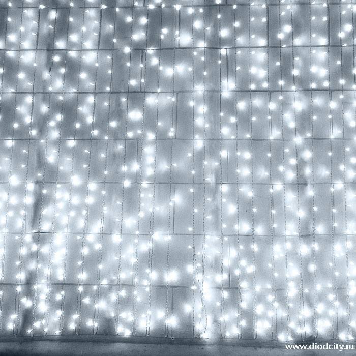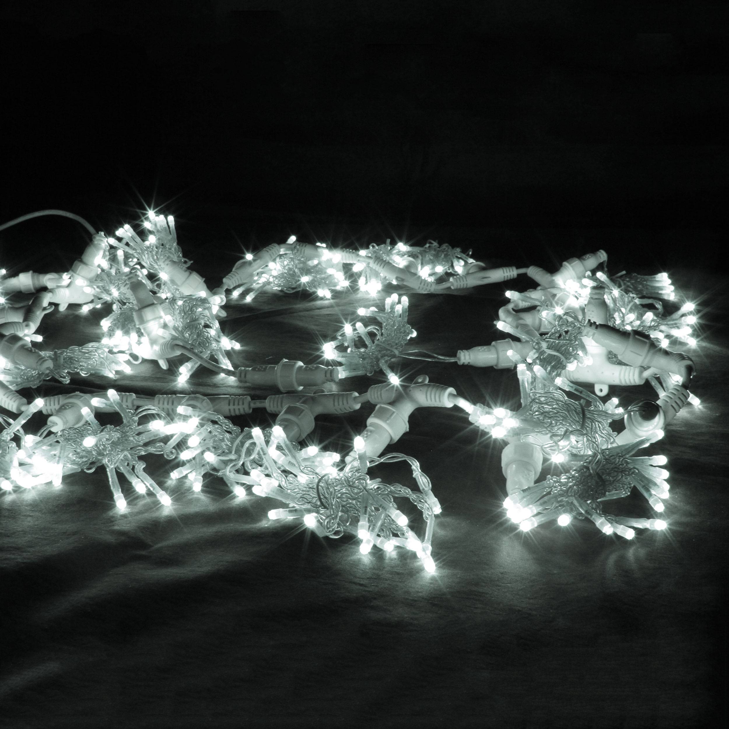 Белые светодиоды расположены на нитях из прозрачного/ чёрного провода длиной 9 метров. Ширина светового устройства (шина) составляет 2 метра. Потребляя всего 110 Вт, гирлянда является выгодным предложением, поскольку ресурс диодов составляет до 100 000 часов.