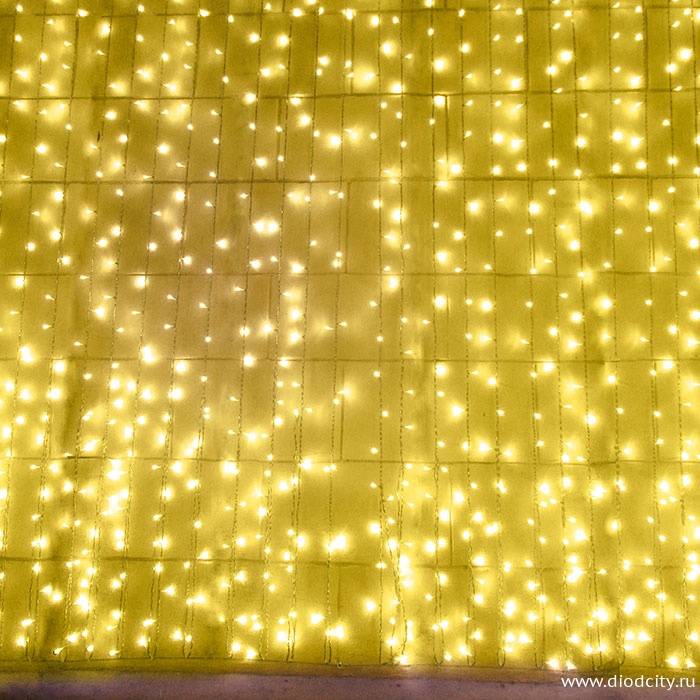 Желтые светодиоды расположены на нитях из прозрачного/ чёрного провода длиной 9 метров. Ширина светового устройства (шина) составляет 2 метра. Потребляя всего 110 Вт, гирлянда является выгодным предложением, поскольку ресурс диодов составляет до 100 000 часов.