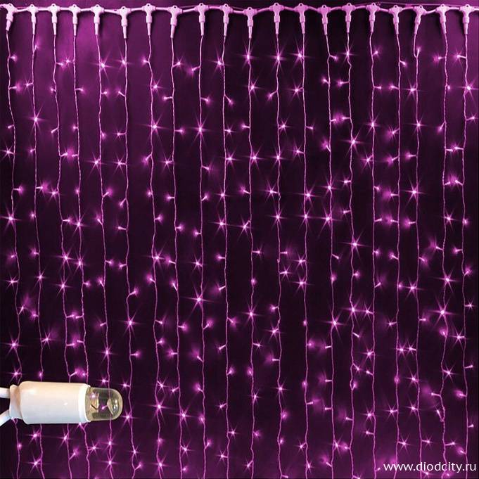 —Светодиодный дождь (занавес) мерцающий 2х3 розовые диоды, белый провод