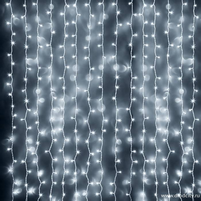 Современный декоративный осветительный прибор – гирлянда «Дождь» с постоянным свечением обладает высокой степенью защиты. Благодаря индексу IP 65 светодиодный занавес с белыми диодами можно применять в помещении и на улице: в любых погодных условиях, электропроводка изолирована ПВХ пластикатом.