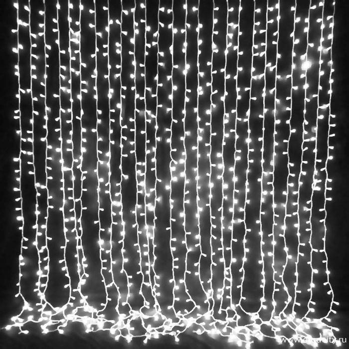 Современный декоративный осветительный прибор – гирлянда «Дождь» с постоянным свечением обладает высокой степенью защиты. Благодаря индексу IP 65 светодиодный занавес с белыми диодами можно применять в помещении и на улице: в любых погодных условиях, электропроводка изолирована ПВХ пластикатом.