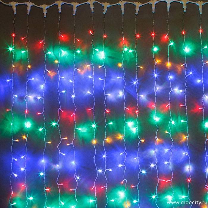 Декоративный разноцветный световой занавес «Дождь» фиксинг – эффектное и надёжное светотехническое устройство постоянного свечения. Уровень защиты IP 65 и провод из каучука позволяют гирлянде функционировать в любых погодных условиях, а разноцветные огни светодиодов поднимут настроение в праздник и будни.